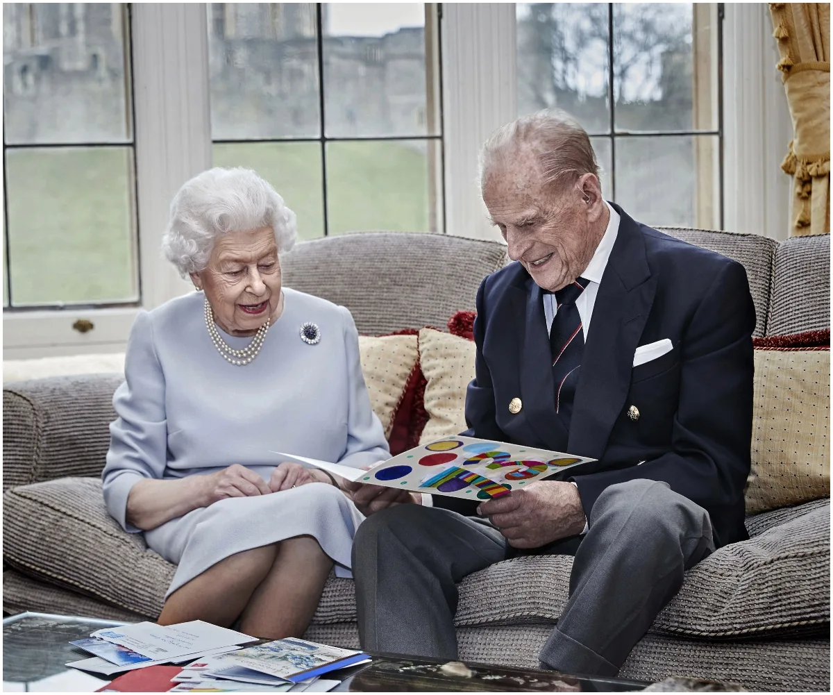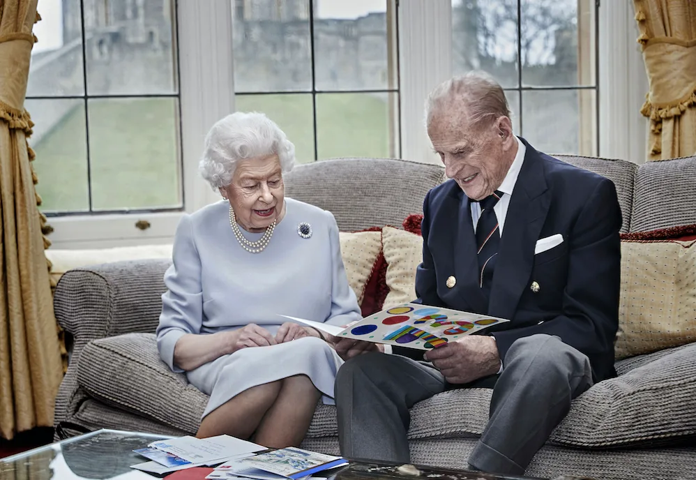 The beautiful image features The Queen and Philip looking at a card made by their great gradnchildren.
