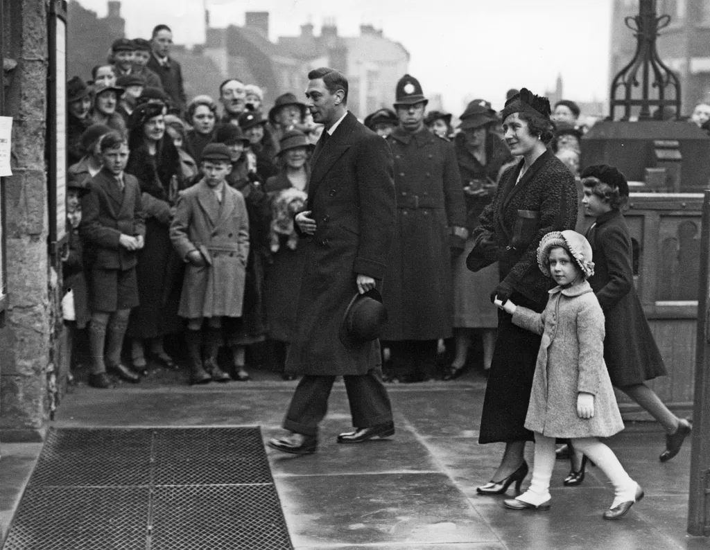 The Duke and Duchess of York (later King George VI and Queen Elizabeth) arriving at a church service with Princess Margaret and then Princess Elizabeth in 1936.