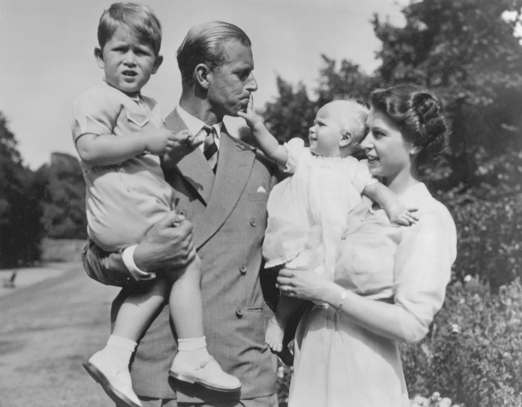 Then-Princess Elizabeth holds a baby Princess Anne as she walks the grounds of Clarence House with Philip, who holds Prince Charles, in 1951.