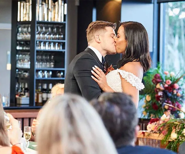 The couple shared a sweet kiss during their wedding reception.