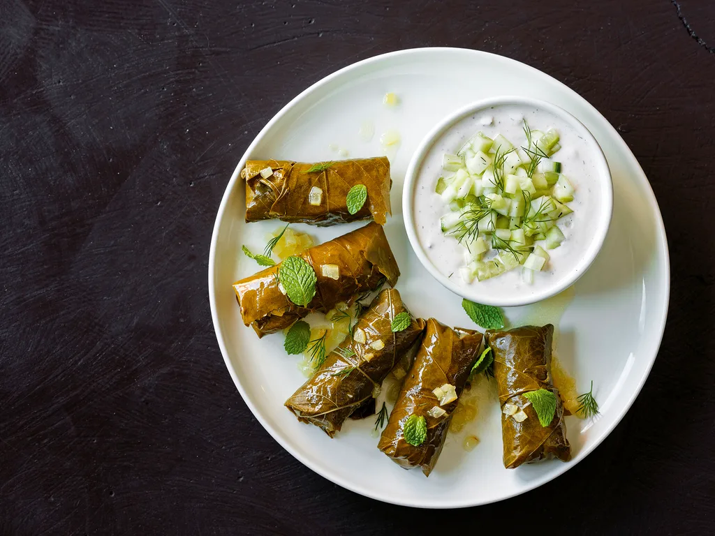 Mediterranean dolmades with cashew tzatziki make the perfect appetiser for your next dinner party.