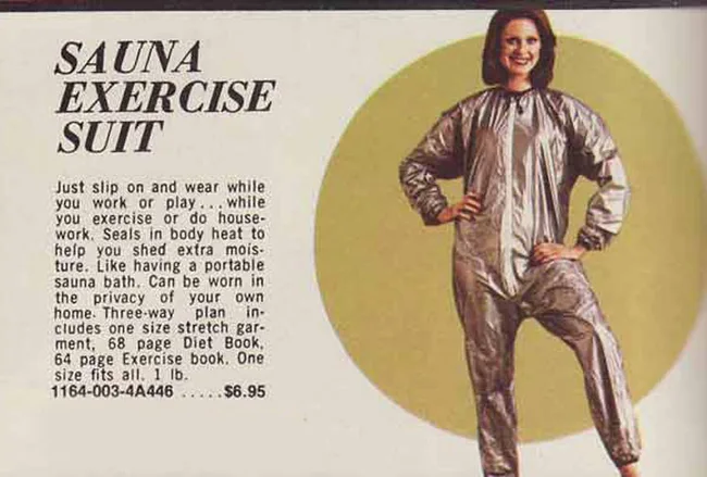 Instead of working up a sweat jogging, 70s men and women preferred to perspire in plastic clothing while doing no physical activity at all.