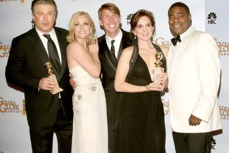 30 Rock took out the award for Best Television Series — Musical or Comedy. Pictured are stars Alec Baldwin, Jane Krakowski, Jack McBrayer, Tina Fey and Tracy Morgan.