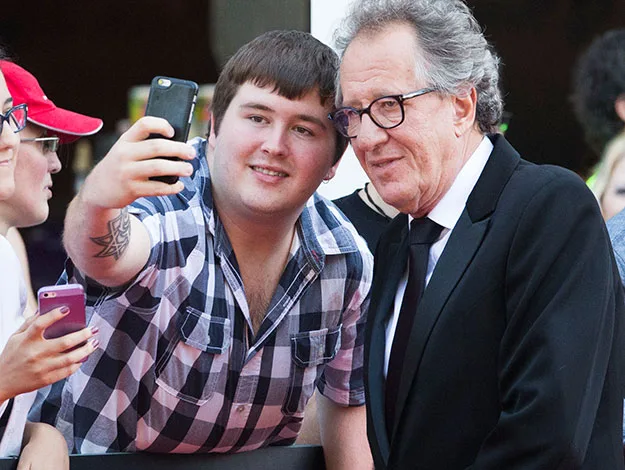 Oscar winner Geoffrey Rush poses for a snap with a fan.