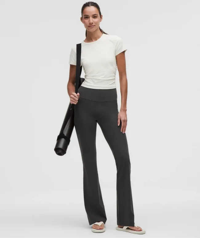 For a perfect blend of comfort and style, these flared pants are made from a buttery-soft fabric. A flattering fit with a trendy flare, these pants are ideal for yoga or everyday wear.