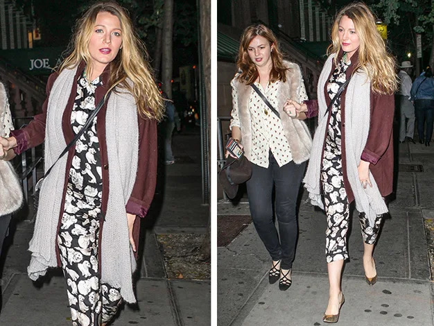 Blake’s bump bloomed in this floral jumpsuit which she teamed with a thick burgundy coat and oversized grey knitted scarf.