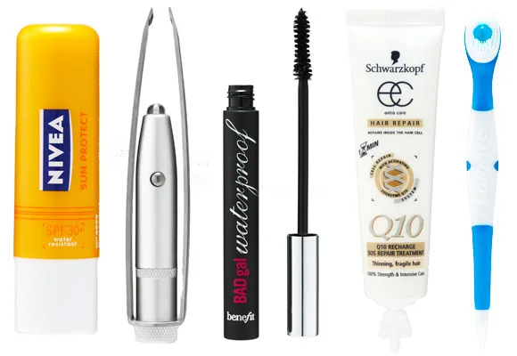 Nivea Sun Protect, $3.98, 1800 103 023. 1000 Hour Lighted Tweezers, $14.95, (02) 9526 0777. Benefit BadGal waterproof mascara, $36, (02) 8353 5000. Schwarzkopf Extra Care Q10 Recharge SOS Treatment, $7.99 for pack of three, 1800 022 219. Colgate Wisp, $3.49 for pack of four, 1800 802 307.