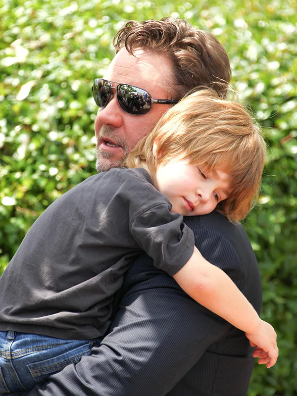Actor Russell Crowe carries his son Tennyson Crowe at the Robin Hood photo call in 2010.