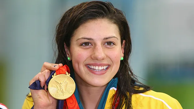 Stephanie Rice poses with one of her gold medals at the Beijing Olympics.
