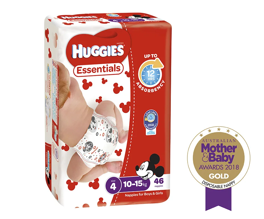 Huggies Essentials Nappies, $13 (pack of 46), provides up to 12 hours of leakage protection and a ‘leak lock’ system provides absorbency by quickly drawing away moisture.