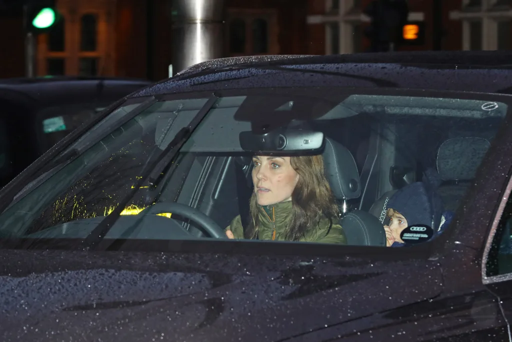 The Duchess travelled with her young son Prince Louis in the back seat.