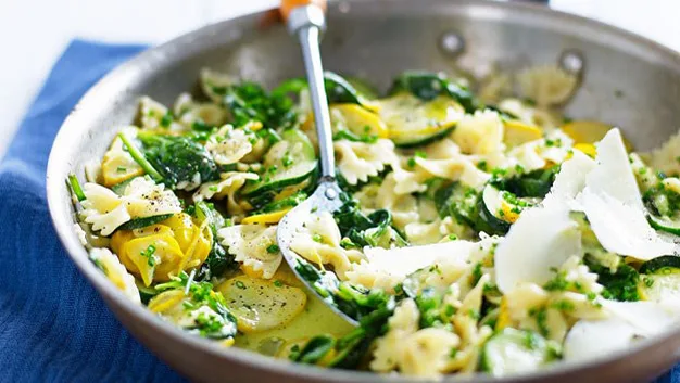 Pasta with zucchini, spinach, and shaved cheese in a skillet, garnished with herbs and black pepper.